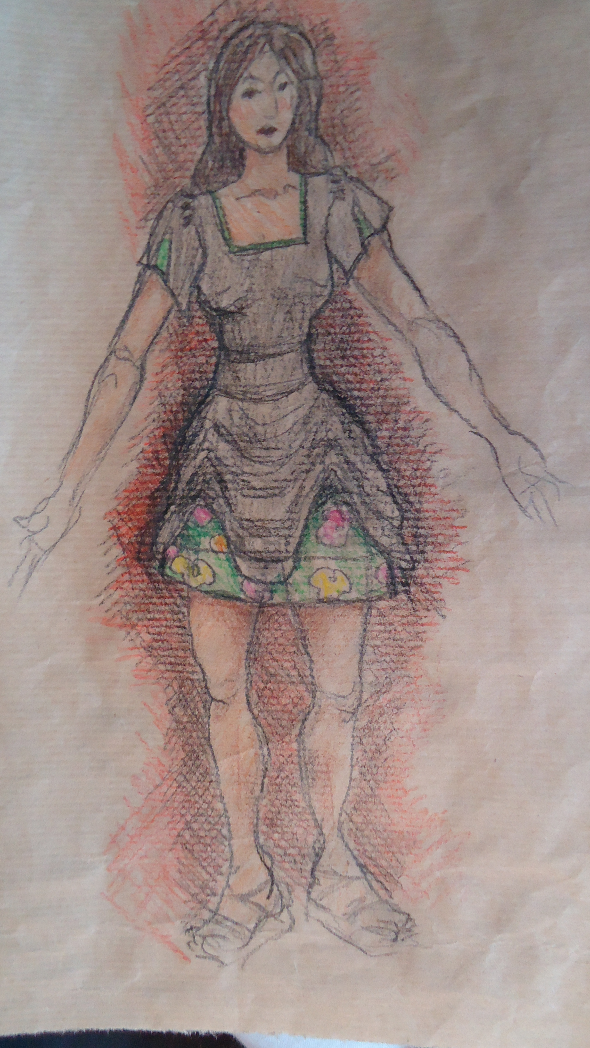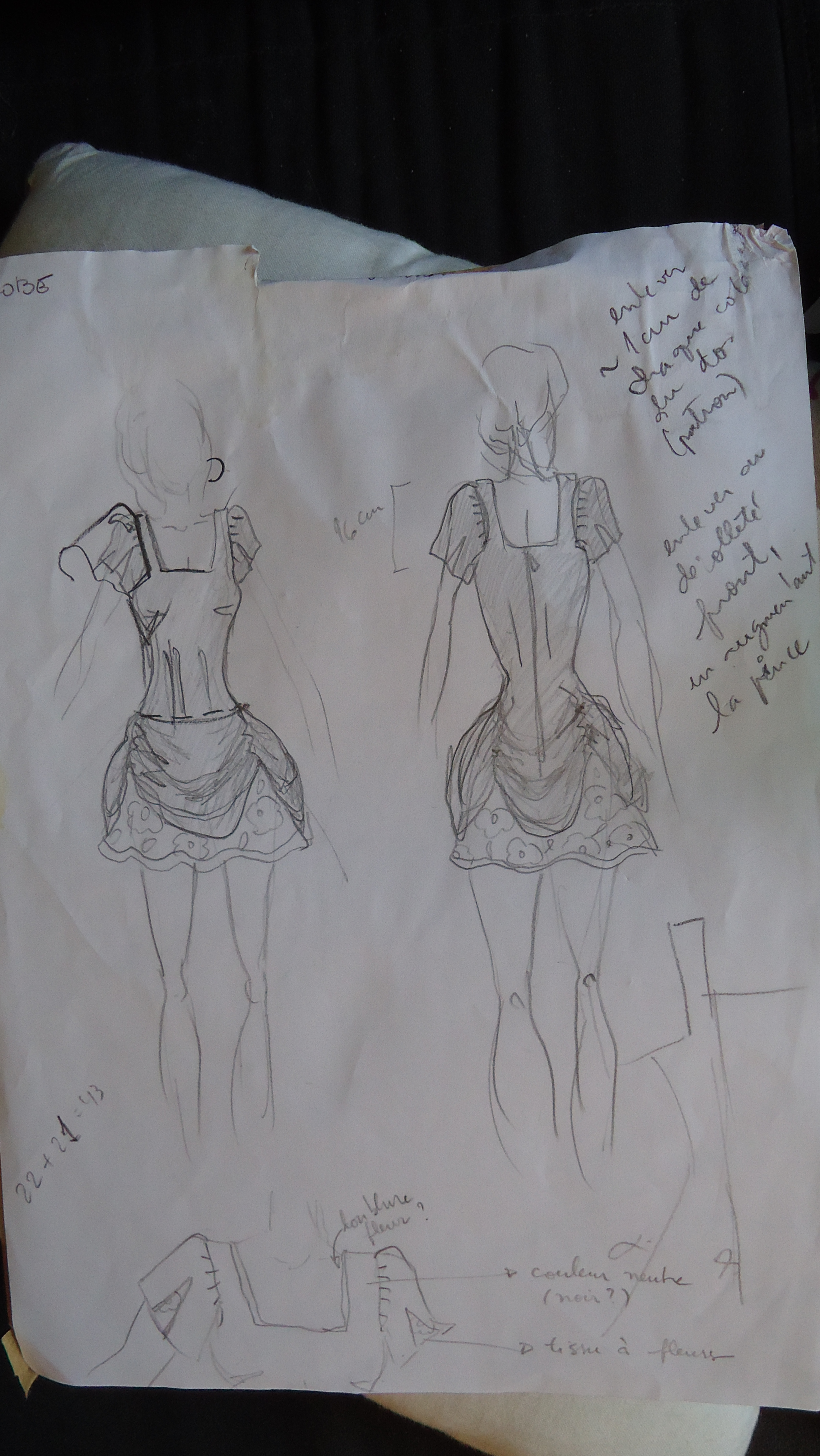Mon idée a été de faire une chemise kimono liée à une jupe corolle en demi-cercle. Voici mon croquis: