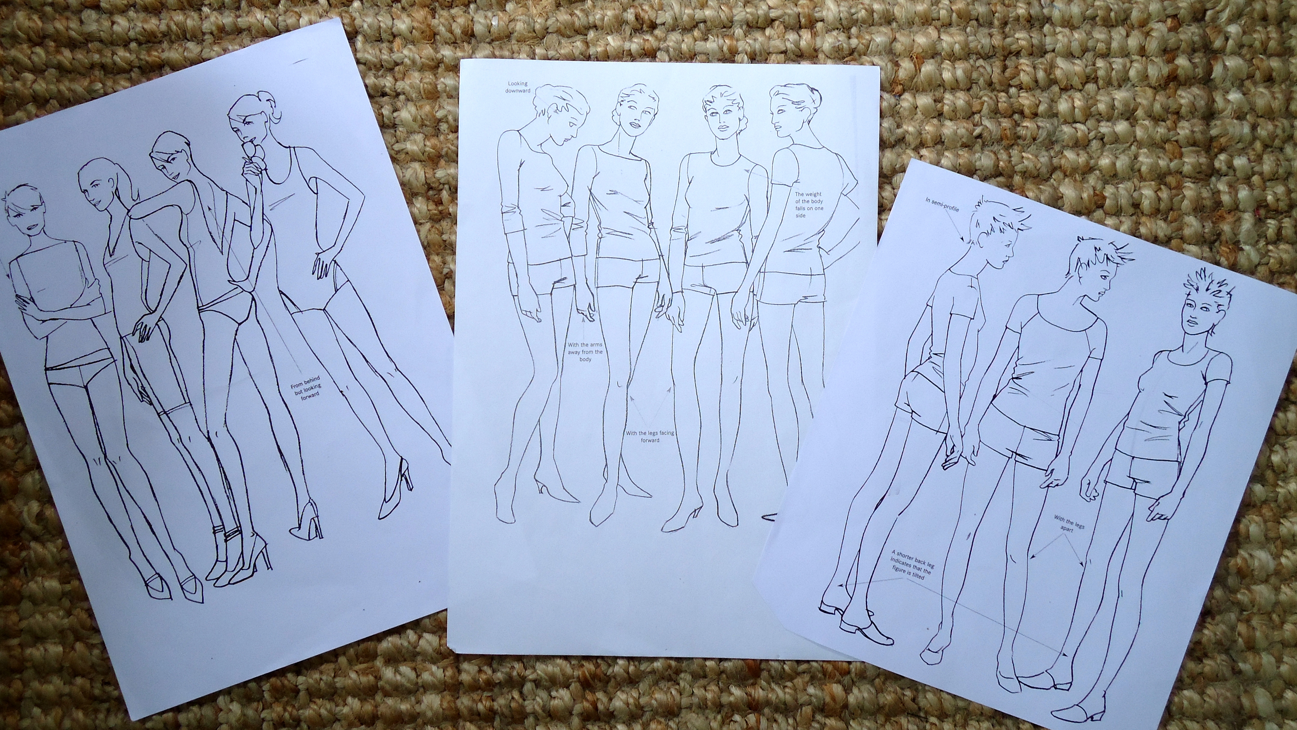 Personnellement, j’aime bien me baser sur ces poses mais dessiner les figures à main libre; sinon, il est toujours possible de transférer les figures par transparence sur un papier blanc et y ajouter les vêtements. Aussi, généralement on dessine une représentation de la création de face et une autre, plus petite, qui montre la pièce de dos.