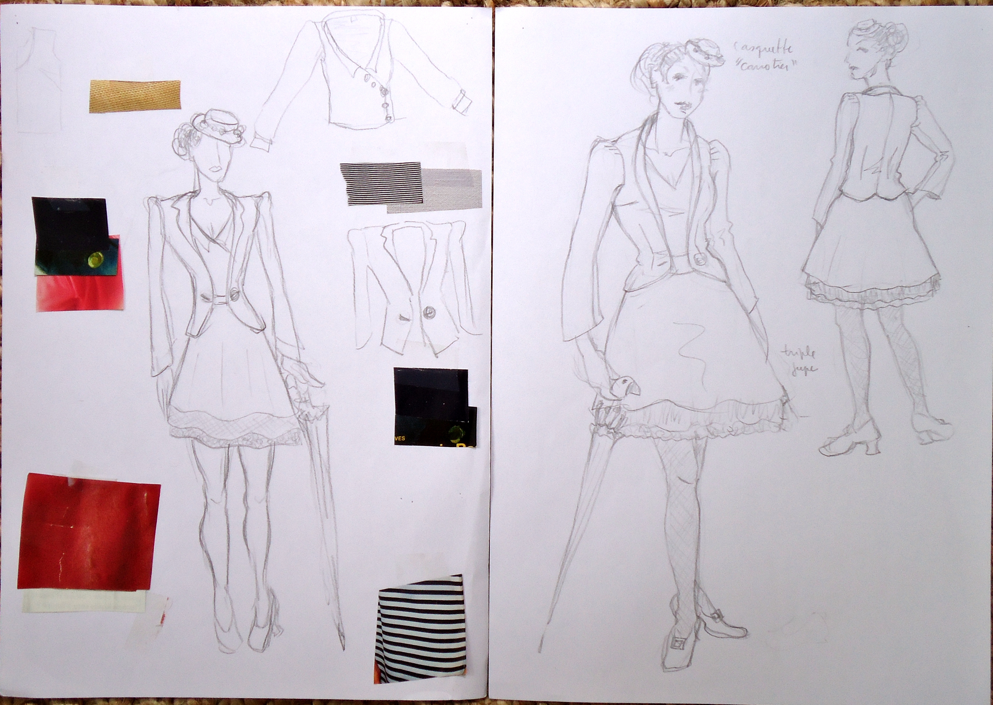 Ici j’ai représenté le serre-tête « canotier », la veste en velours et la triple jupe (soie, tulle et dentelle, dans l’ordre). Tous ces éléments, avec la gamme de couleurs et les échantillons de tissu, vont aider à construire une idée solide du concept représenté.