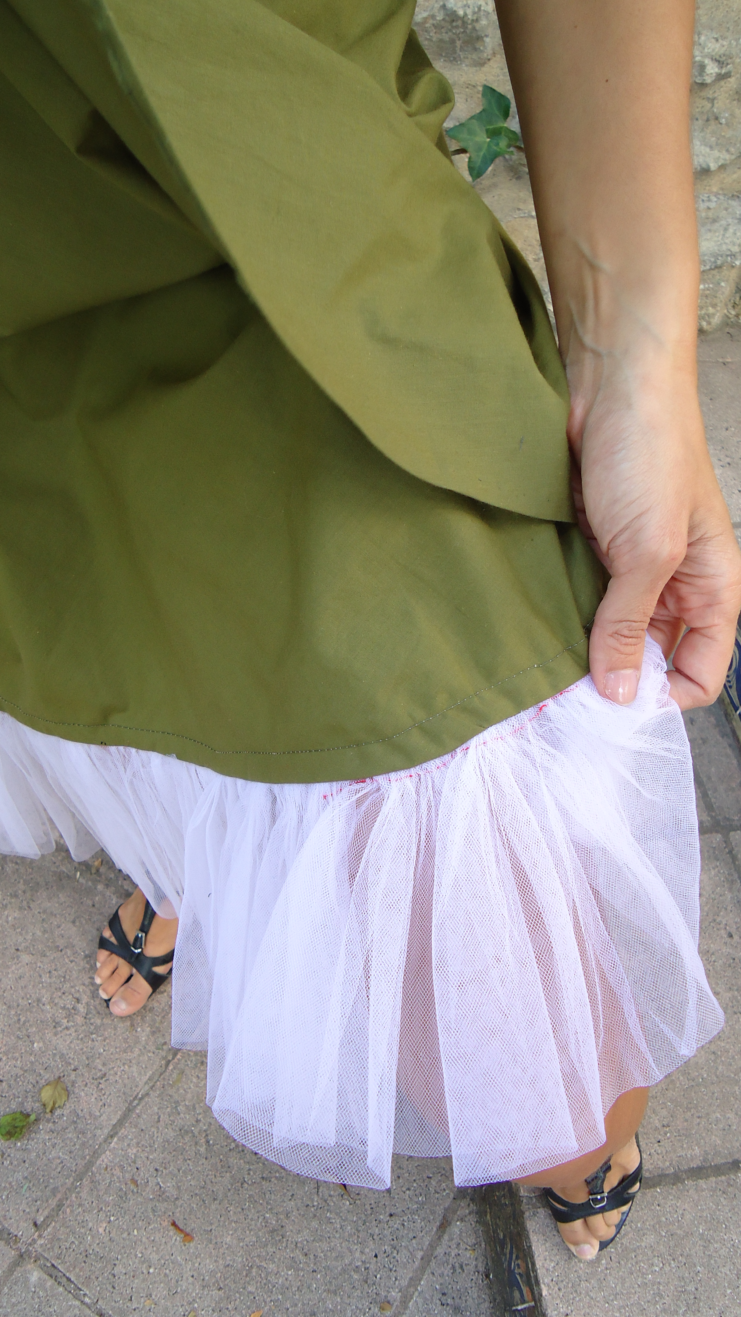 Au-dessus, on voit la jupe « externe », et au-dessous la doublure avec le tulle. Ce dernier a été attaché à la jupe avec un biais, pour éviter une couture inconfortable contre le corps: