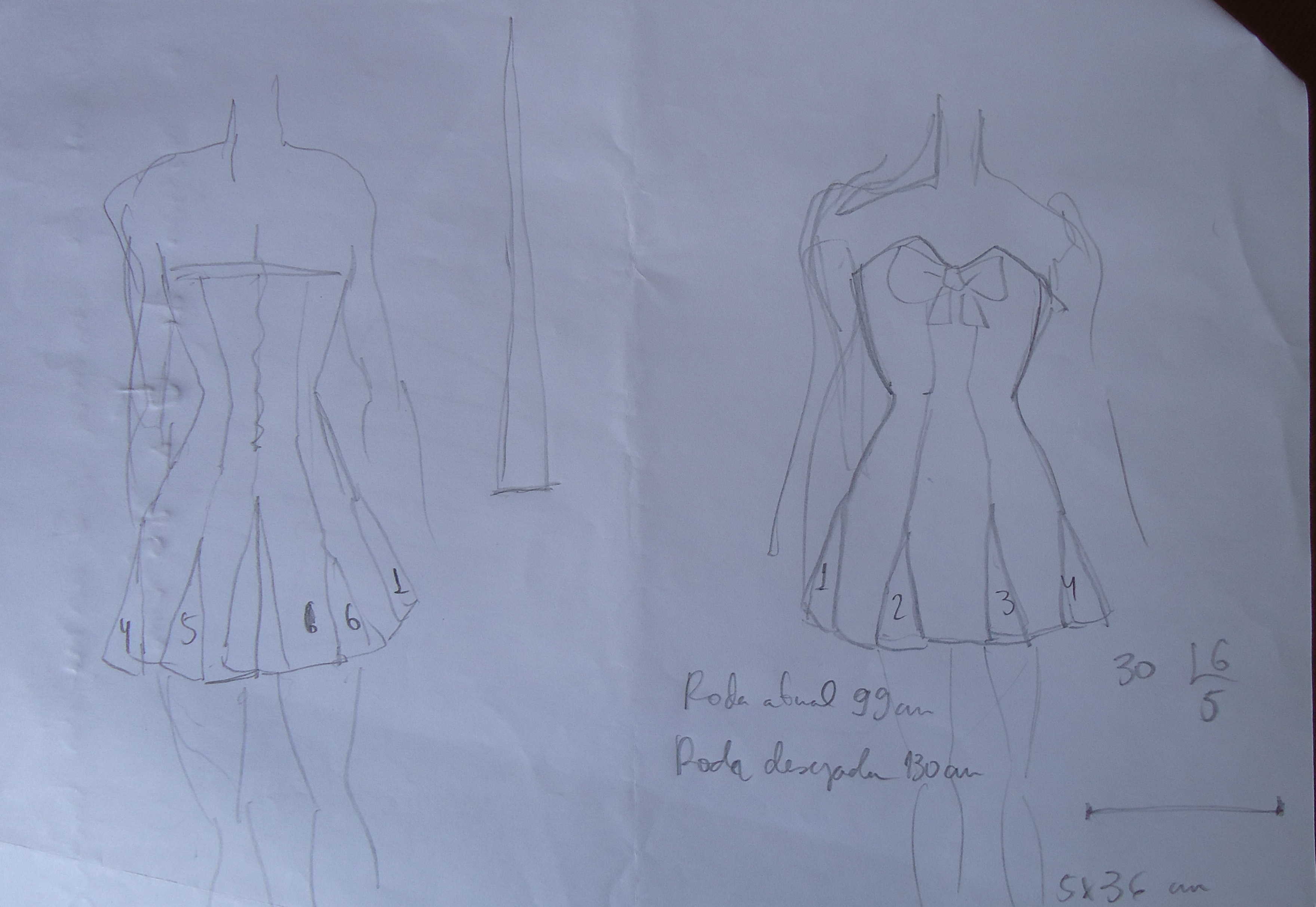 La jupe est quasiment prête ; on va s’occuper ensuite du haut avant de les coudre ensemble. Enfilez le haut (ou, si vous avez un mannequin, profitez-le) et puis la jupe; fermez l’ouverture arrière et attachez-la à la bonne hauteur avec une ceinture quelconque. Vérifiez si le haut est bien mis sur le corps, sans un excès de tissu ou des plis bizarres. Souvenez-vous que nous allons encore en couper un morceau à l’arrière. Avec une épingle bien voyante, marquez sur le devant et sur le dos le point où la jupe devra tomber (très important).