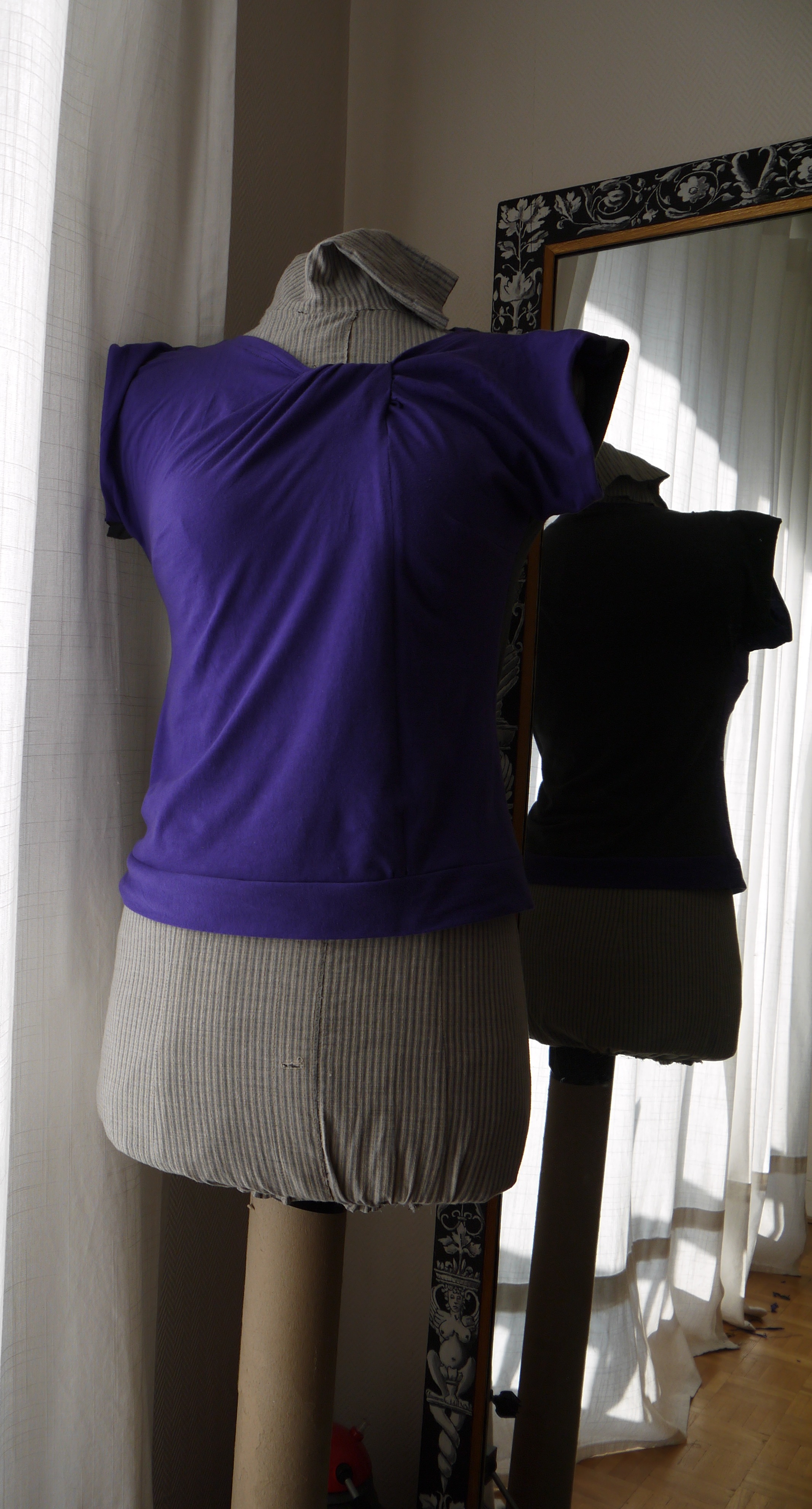 Bien sur, coudre avec des jerseys n’est pas évident – tout le travail de création du patron, de coupe et de couture est différent par rapport aux tissus non-extensibles. Ainsi donc, pour m’entrainer j’ai encore une fois ouvert ma malle de Mary Poppins pour en sortir les vieux tshirts de Monsieur – j’en ai un stock assez important en ce moment et c’est toujours bien d’en utiliser quelques-uns. En plus, si j’en gâchais dans le processus ce n’était pas très important.