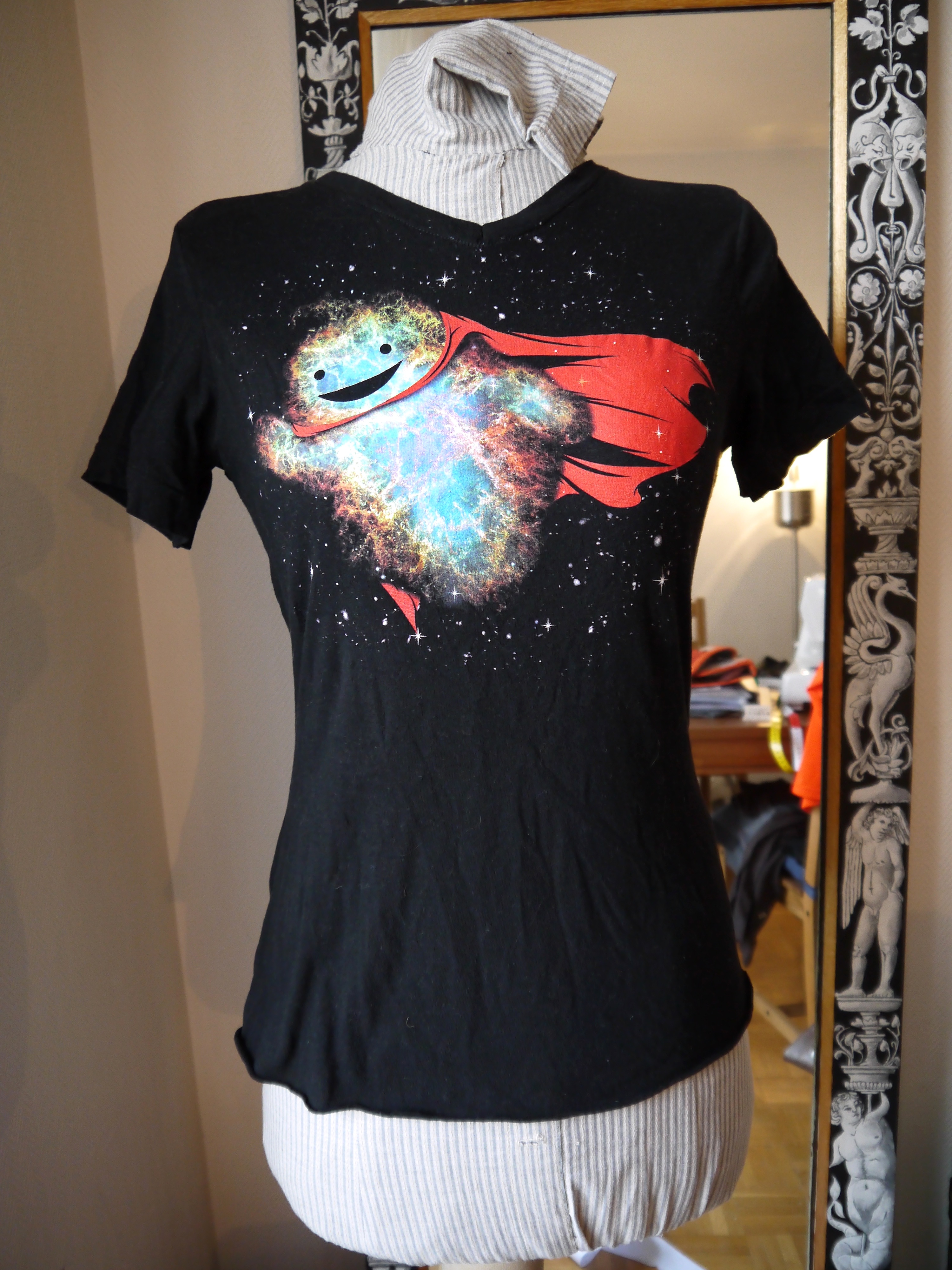 Mes premiers tshirts sont donc des cousins du monstre de Frankenstein ; tandis que ce malheureux était construit avec des morceaux de gens morts, mes tshirts sont faits avec des morceaux de tshirts morts. En certaines occasions j’ai profité de l’image imprimée sur la pièce, en d’autres juste du tissu car la couleur me plaisait.