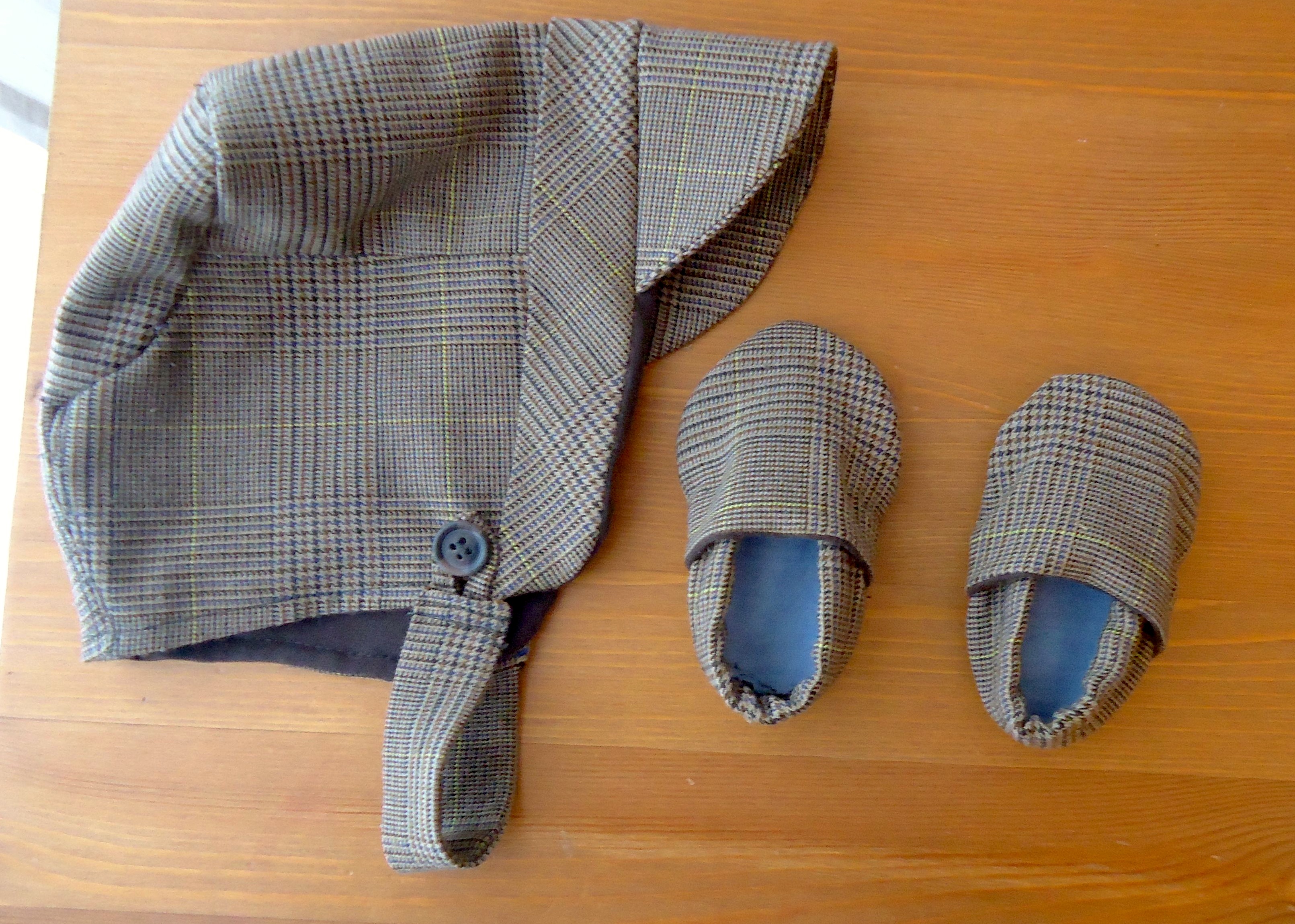 Oui, c’était un garçon mais ce n’est pas moi qui l’ai eu. Je voulais juste partager avec mes chers lecteurs le cadeau que j’ai fait – en couture, bien évidemment – pour le plus jeune marmot d’un de mes amis. Les patrons ne sont pas à moi – le chapeau c’est un projet très sympa qui s’appelle « He’s all boy » qui à mon voir détruit le mythe selon lequel il est moins intéressant d’habiller des petits garçons que des petites filles – et les chaussures viennent d’ici. Les deux sont en anglais.