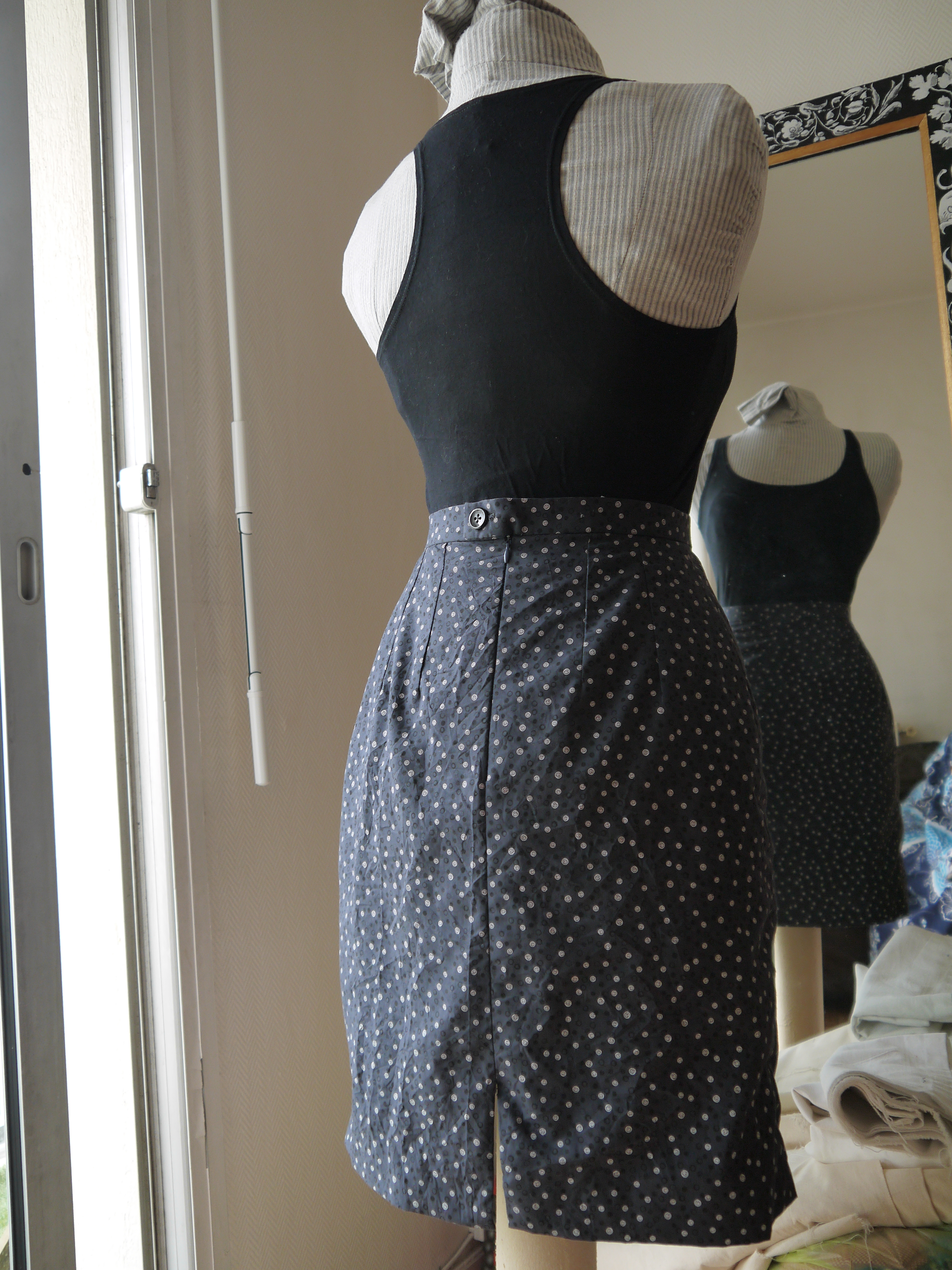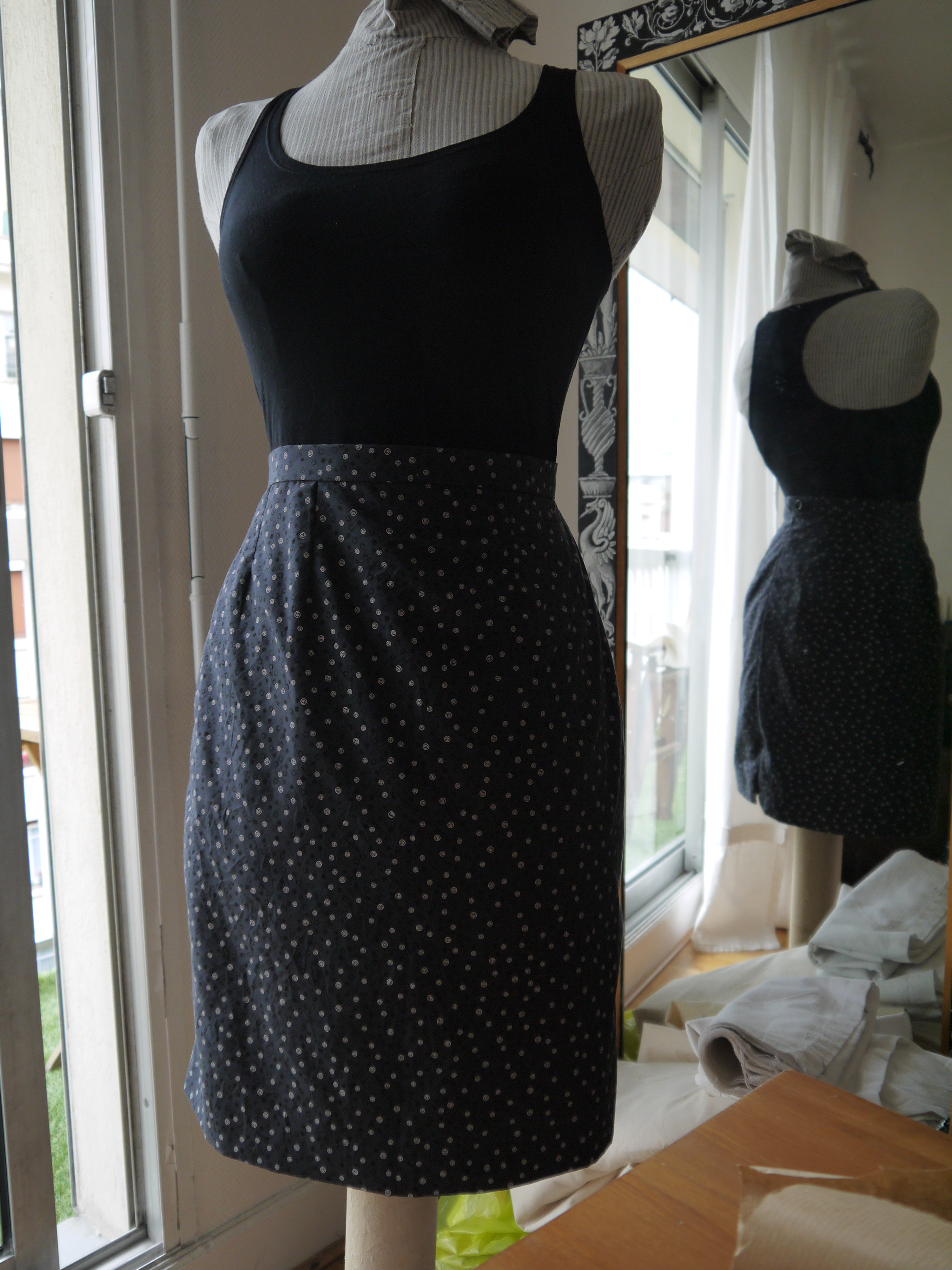 Elle ne tombe pas aussi bien sur le mannequin que sur mon corps (et mes habiletés de repassage laissent beaucoup trop à désirer), mais je pense qu’on peut déjà en faire une idée. La jupe est bien cintrée et j’aimerais bien qu’elle le fut encore un peu plus (je la trouve encore un peu large par rapport à ma propre taille), mais du à la morphologie de mon corps il aurait été nécessaire de modifier le patron et y ajouter une ceinture en forme au lieu de la ceinture droite – ce que je ferai surement pour ma prochaine jupe.