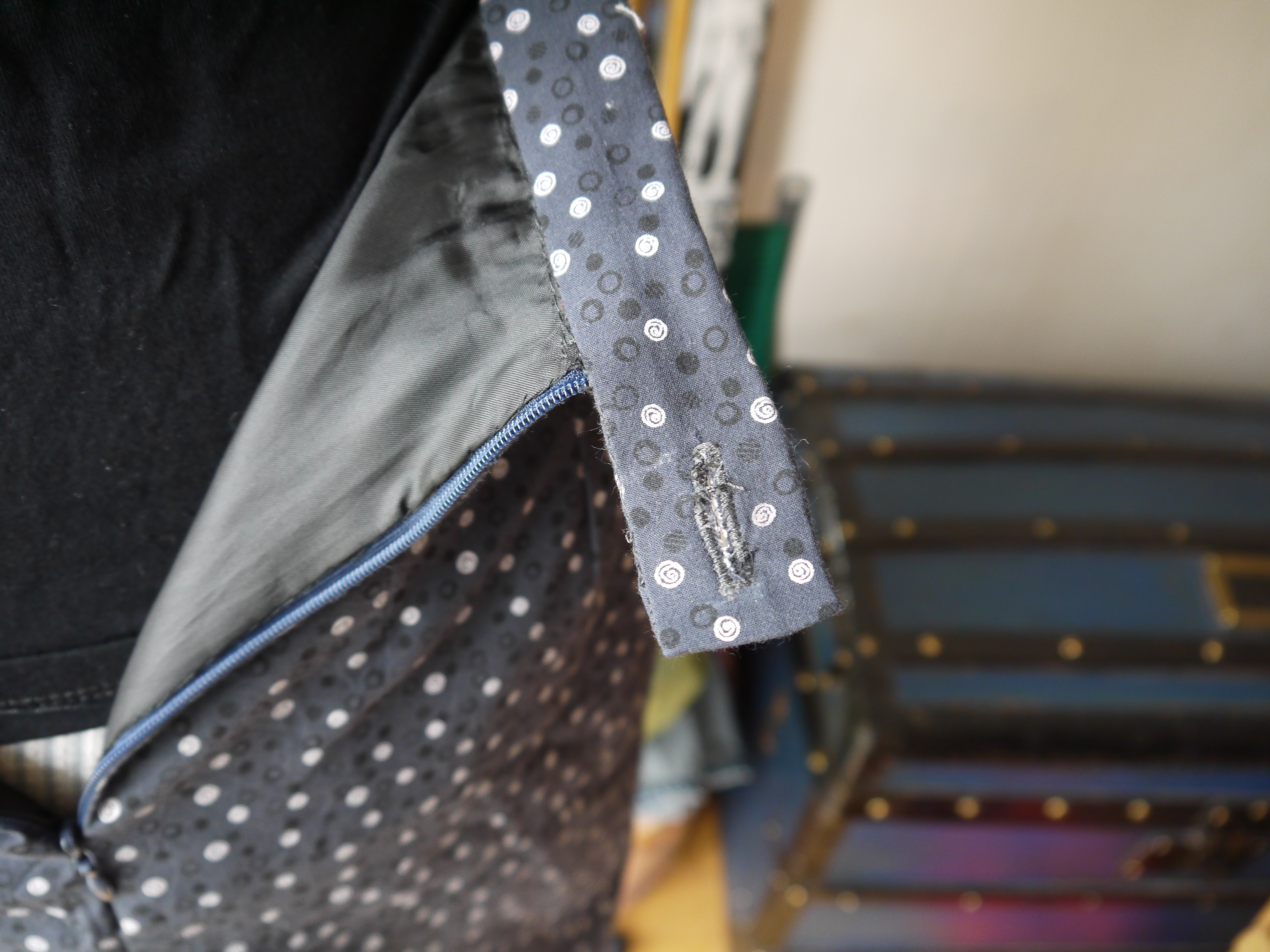 Et voici un détail de la fente; la doublure est cousue à la main sur le bord. Remarquez la belle finition en pointe (à droite). J’essayerai de faire un tuto pour cette finition (et d’autres) lors de la construction de ma prochaine jupe.