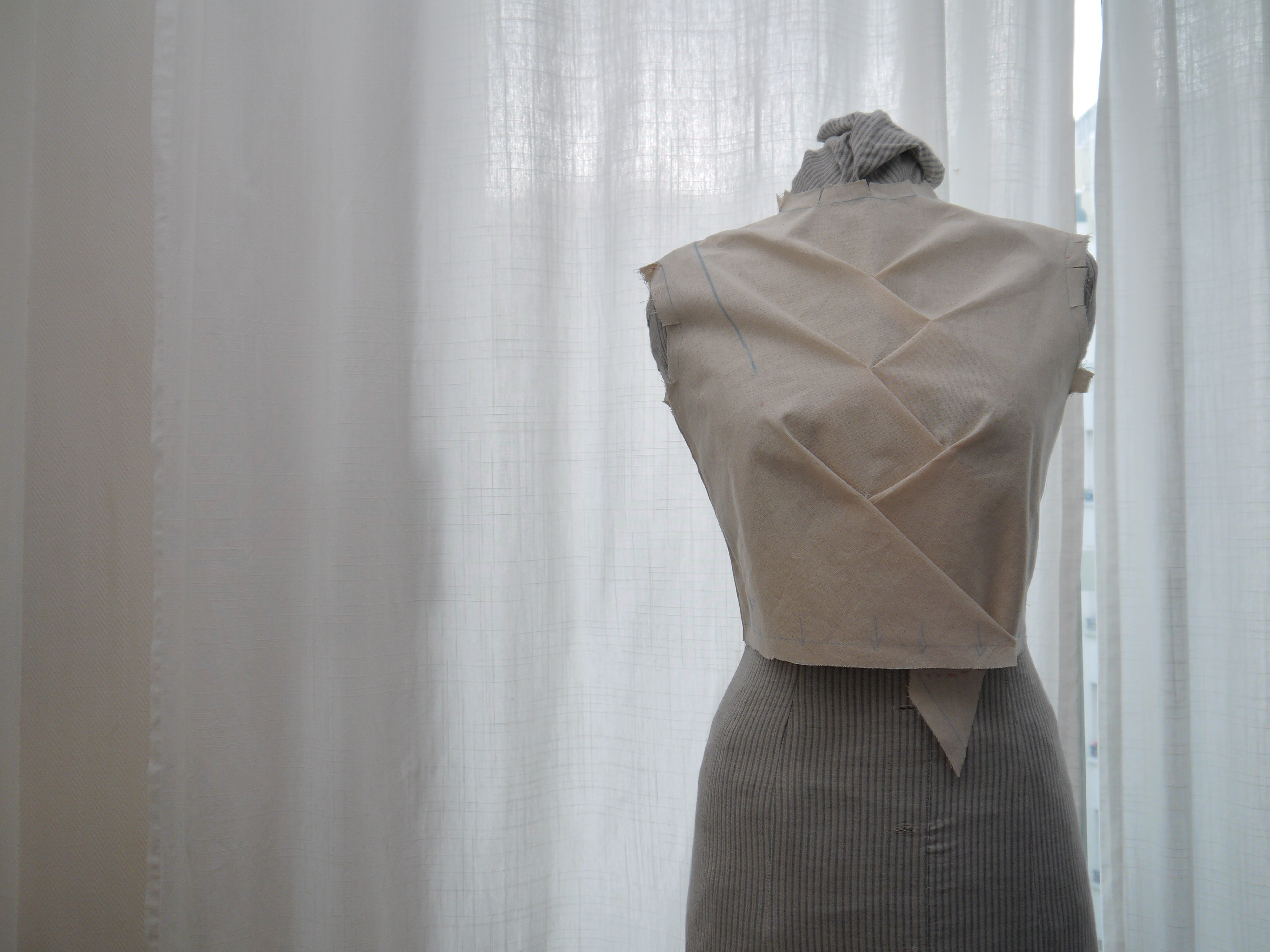 J’ai remarqué sinon qu’après des vacances loin de la machine à coudre (mais dans lesquelles j’ai quand-même lu attentivement chaque ligne de ce premier volume de Pattern Magic et quelques autres ouvrages sur la couture) mes habiletés en couture et patronage se sont améliorées – et je pense que cela se doit à ma méthode de travail, que j’utilise en effet pour d’autres activités (comme le dessin ou la cuisine). Elle consiste à construire la pièce d’abord dans la tête, entièrement, dans tous les détails, en laissant de préférence quelques jours pour qu’elle puisse bien se solidifier – et seulement après passer à son exécution, en suivant les pas déjà créés dans l’esprit par avance. Malgré la petite bandelette de tissu restée pour une erreur débile quelconque au bas de mon takenoko, je peux dire que je suis plutôt satisfaite de cette collaboration entre mon cerveau et mes mains.