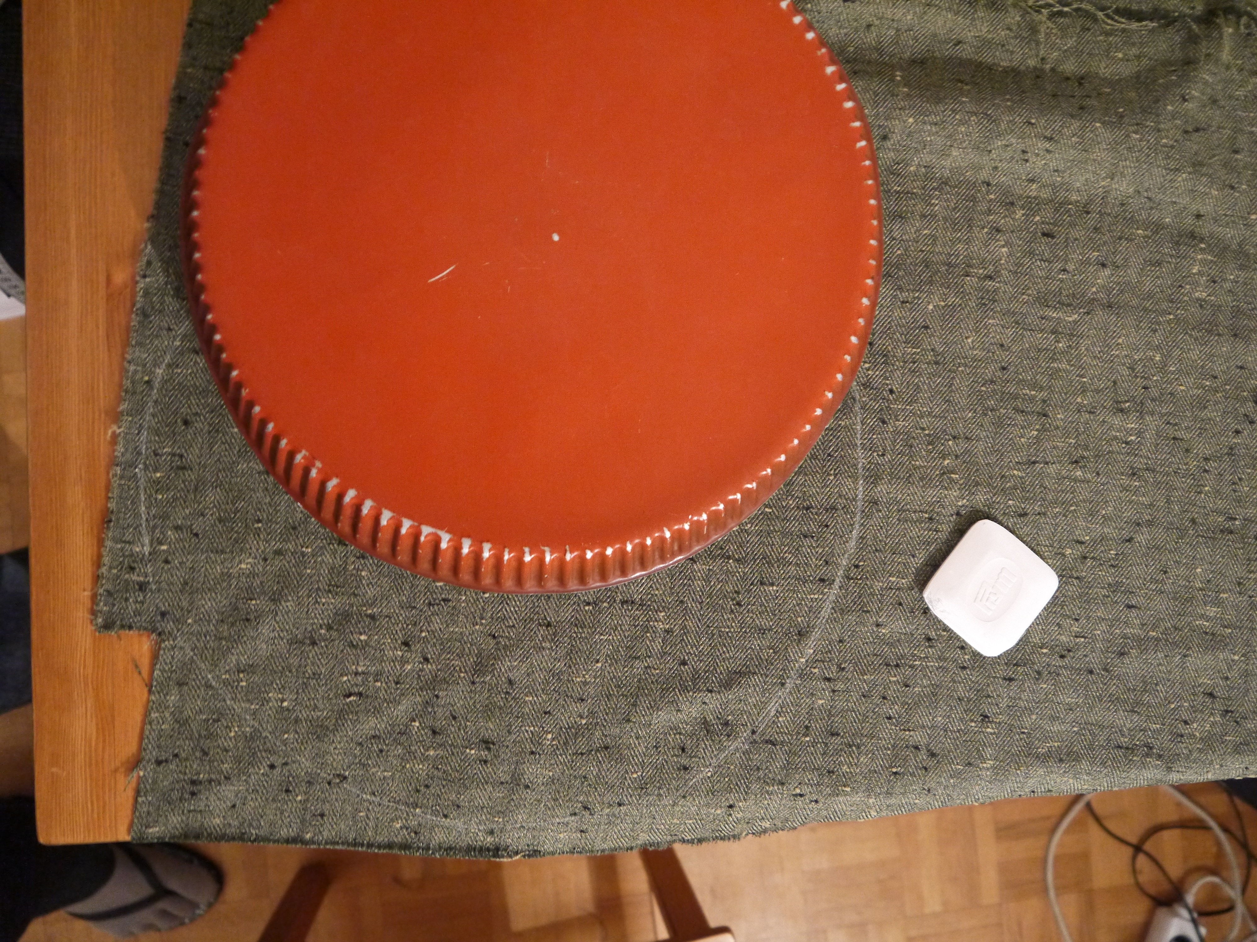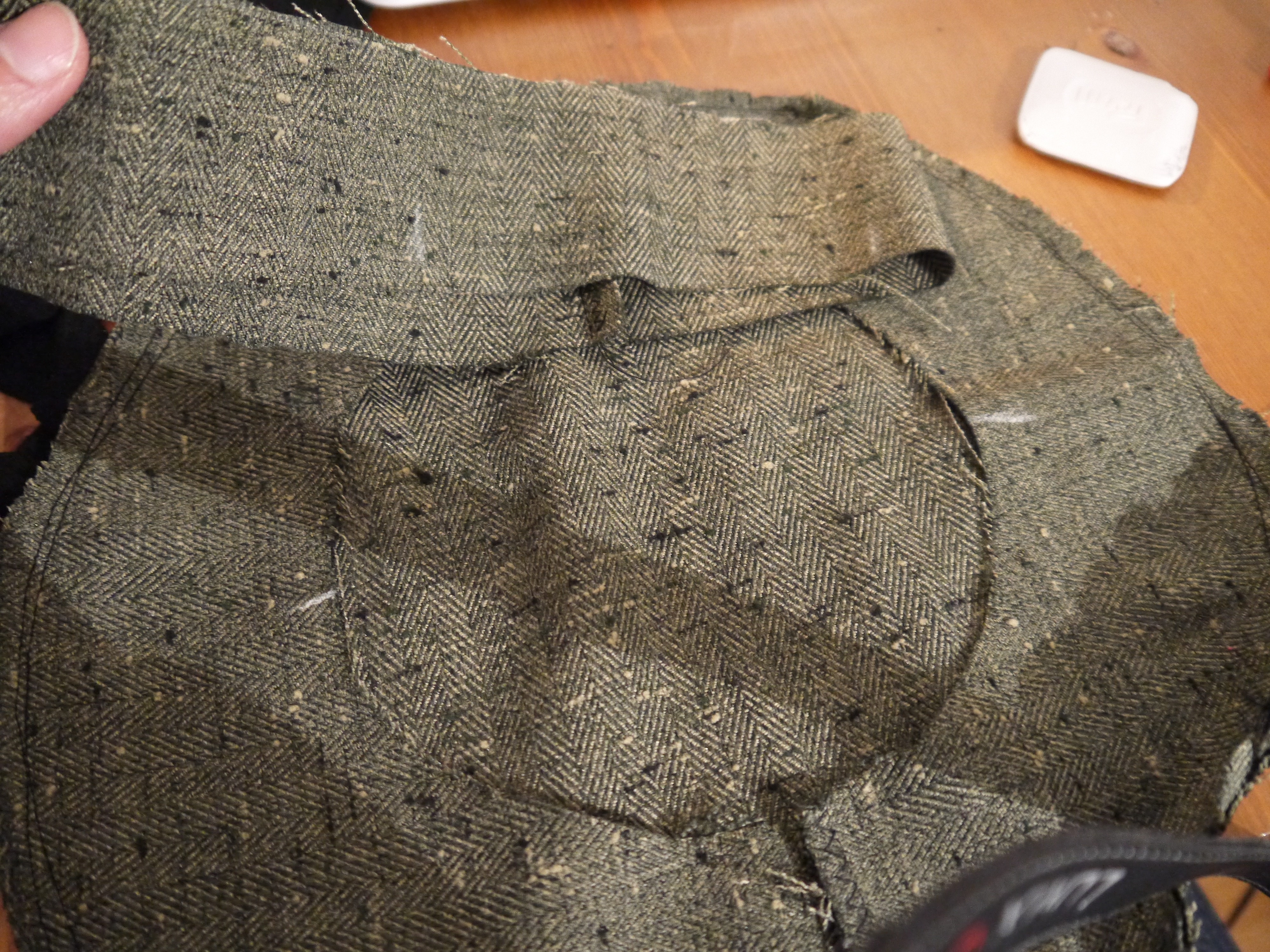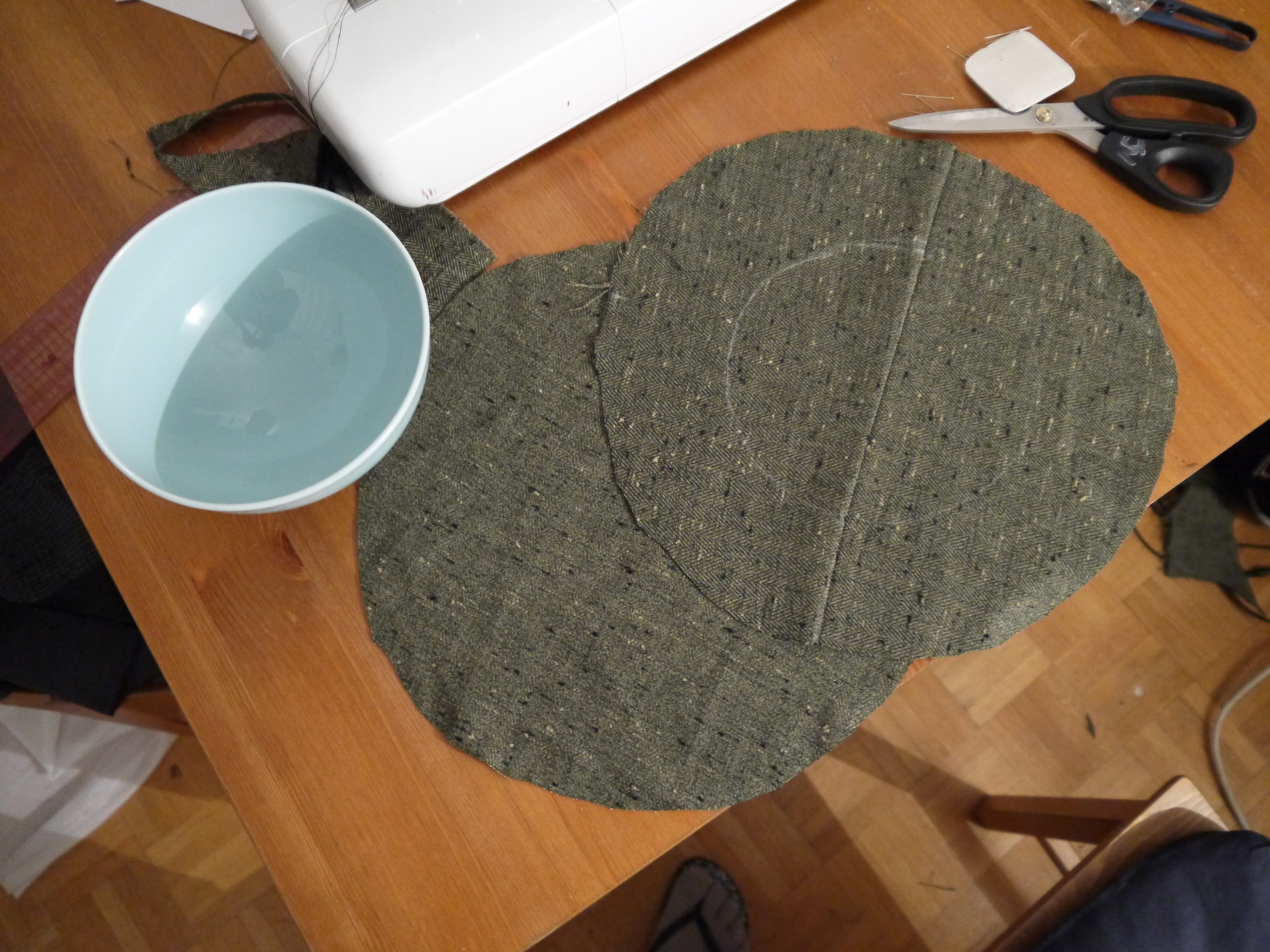 2. Au centre d’un de ces cercles, en dessiner un deuxième de 15cm de diamètre et le découper (ici j’ai cousu deux morceaux de tweed car je n’en avait pas assez mais il est mieux de le faire en un seul morceau).