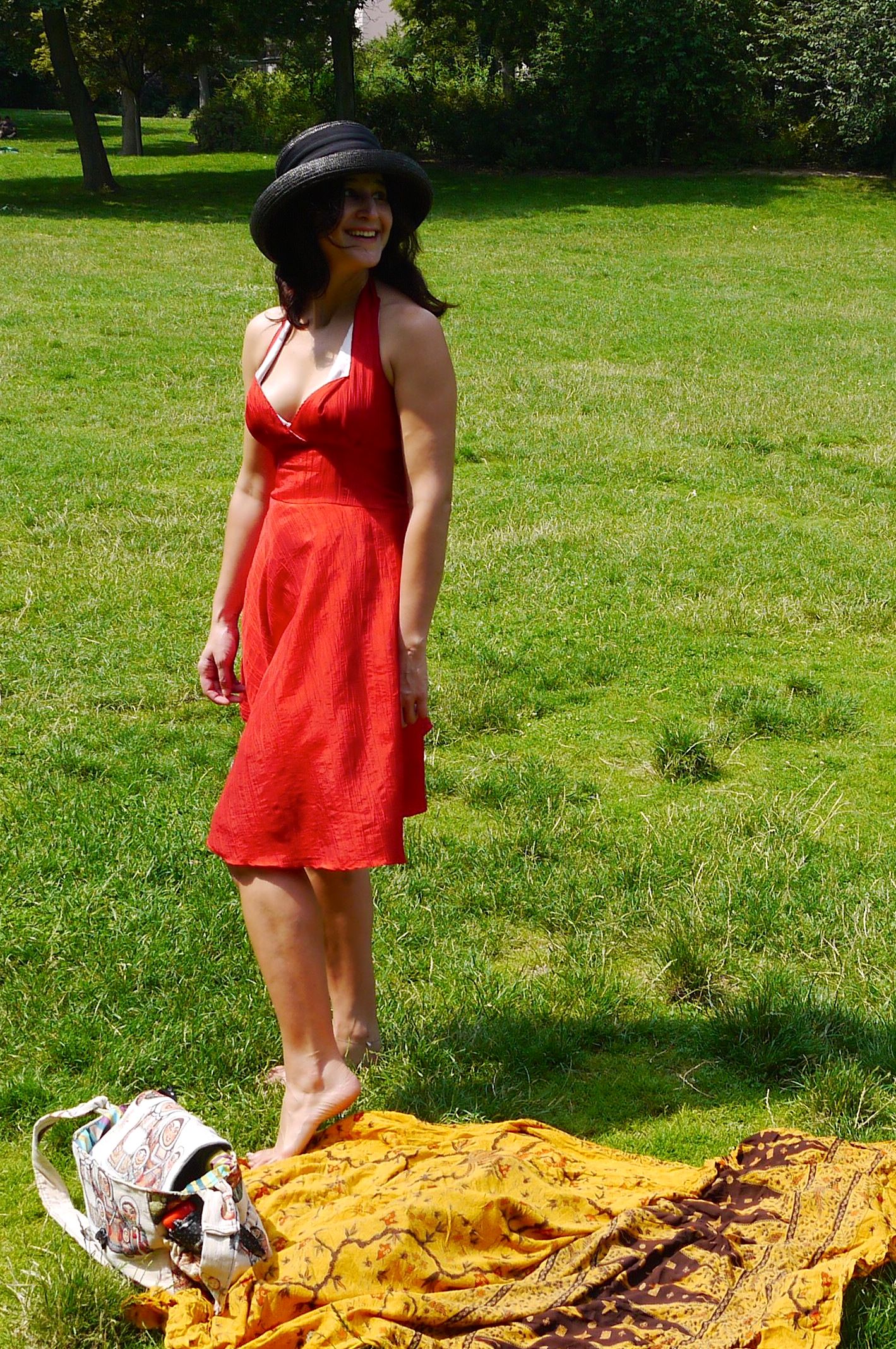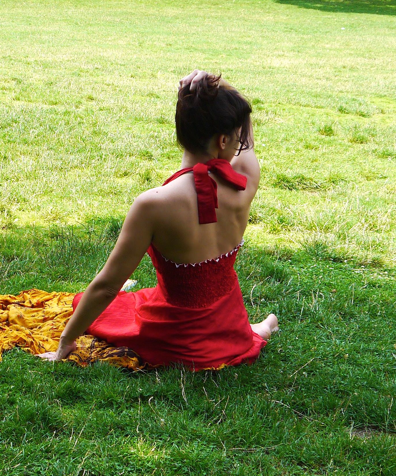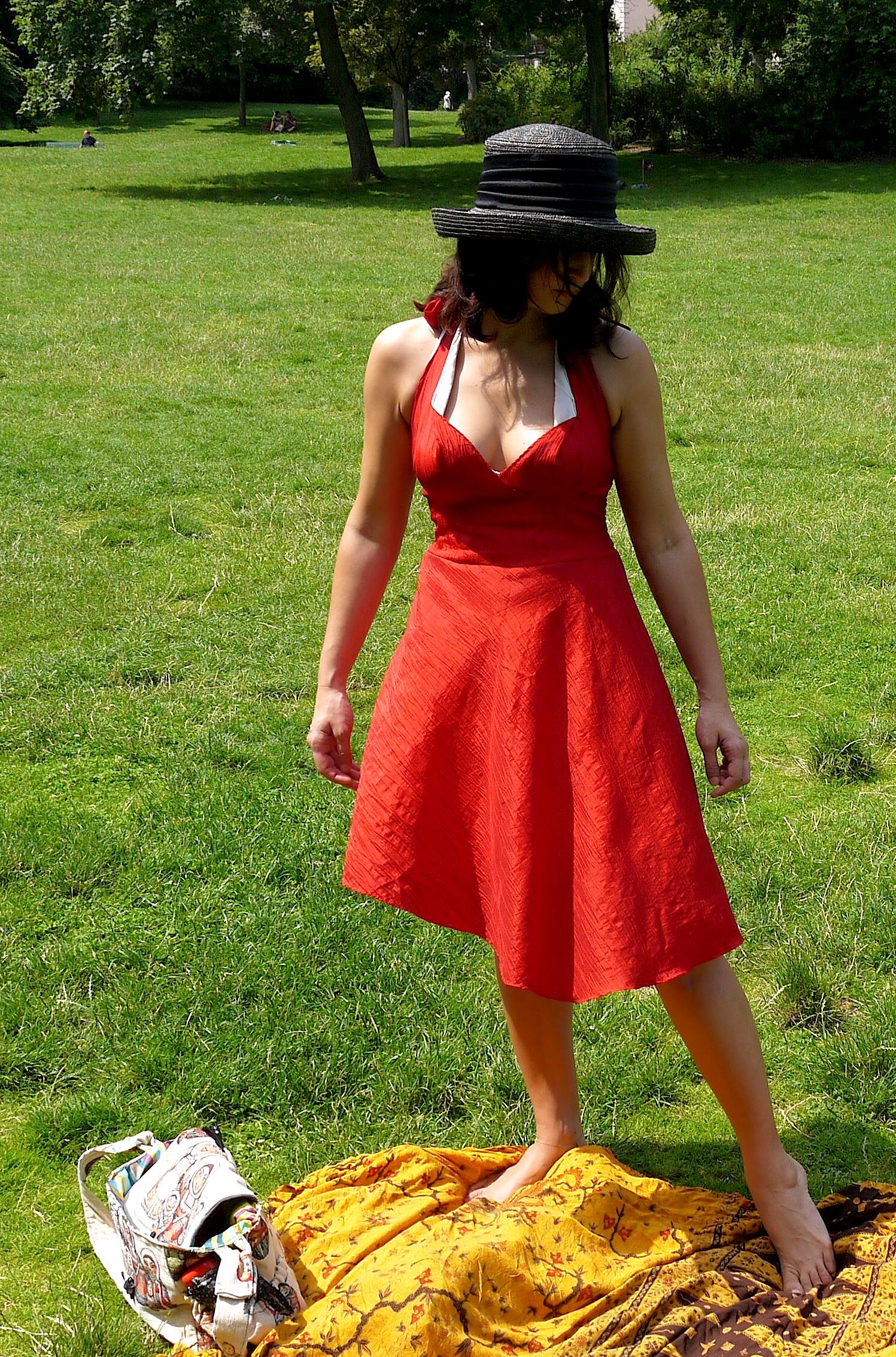 Voilà donc ma dernière création dont vous avez pu voir le dessin il y a un mois. Il s’agit de la Robe Atmosphere, tres fraiche et agréable à porter, avec une jupe asymétrique bien au gout du jour et un pli au niveau du haut qui laisse voir la doublure et crée un effet d’encolure « sweetheart ».