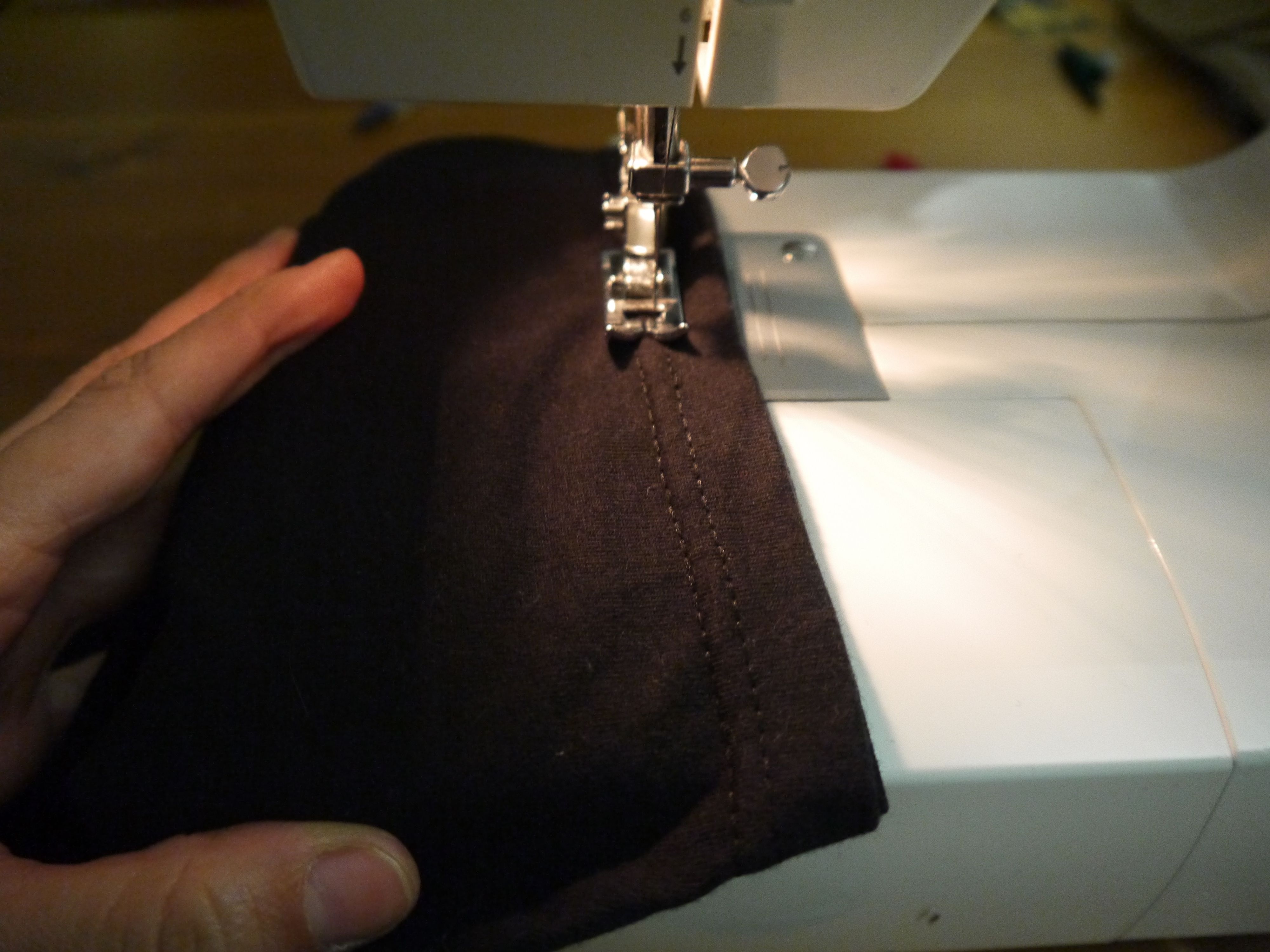 3- Fermer les manches d’un des tshirts (de préférence le plus lourd, qui sera la jupe) sur l’endroit. Elles formeront les poches.