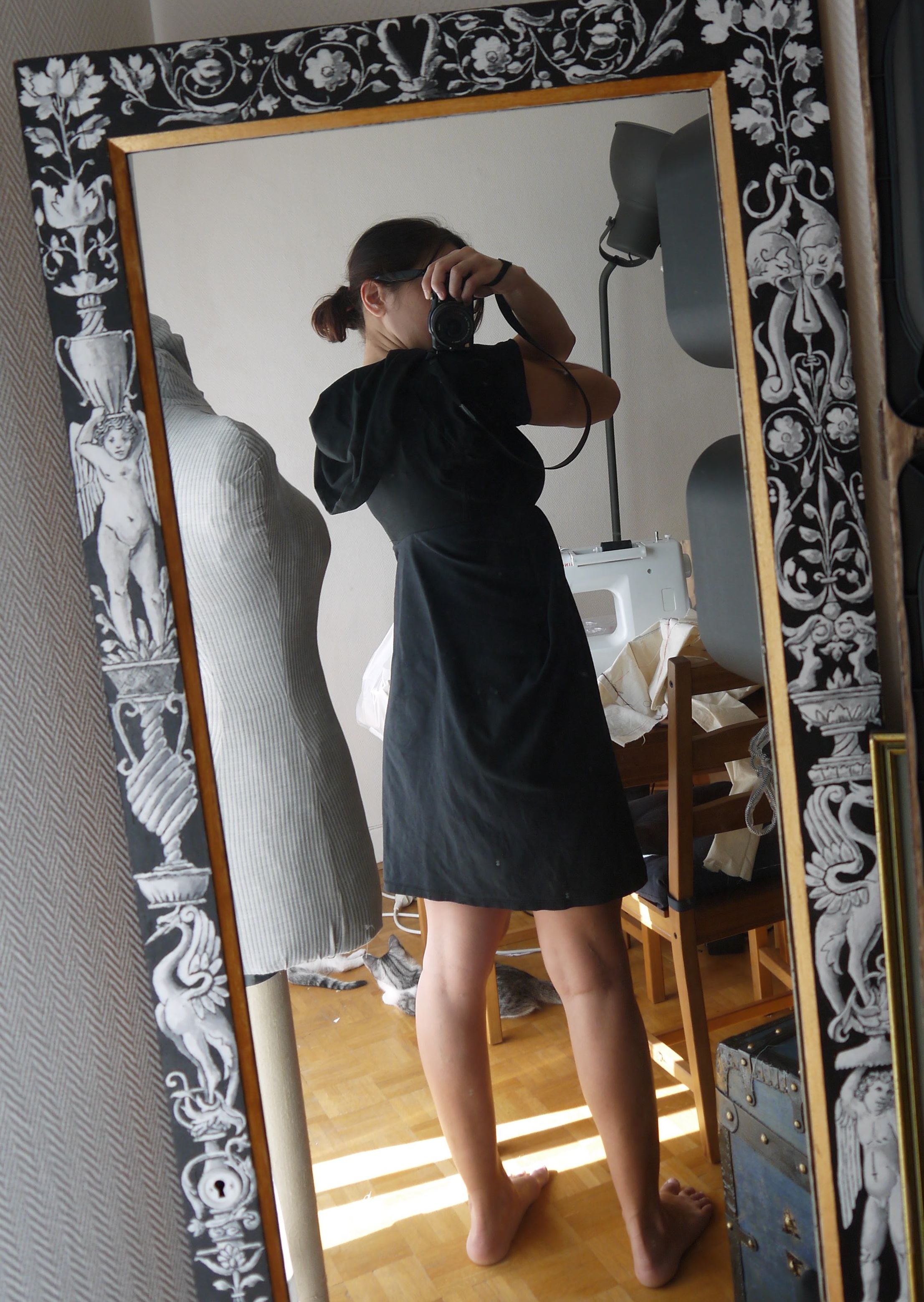 Ou mieux: ce n’est pas tout à fait fini car là il faut essayer la robe sur votre corps et faire les ajustements. Sur moi, la robe était tres grossissante au premier essai. Une maniere que j’ai trouvé de contrer cet effet a été d’utiliser les manches/poches comme une ceinture interne, en les cousant entre elles de cette maniere: