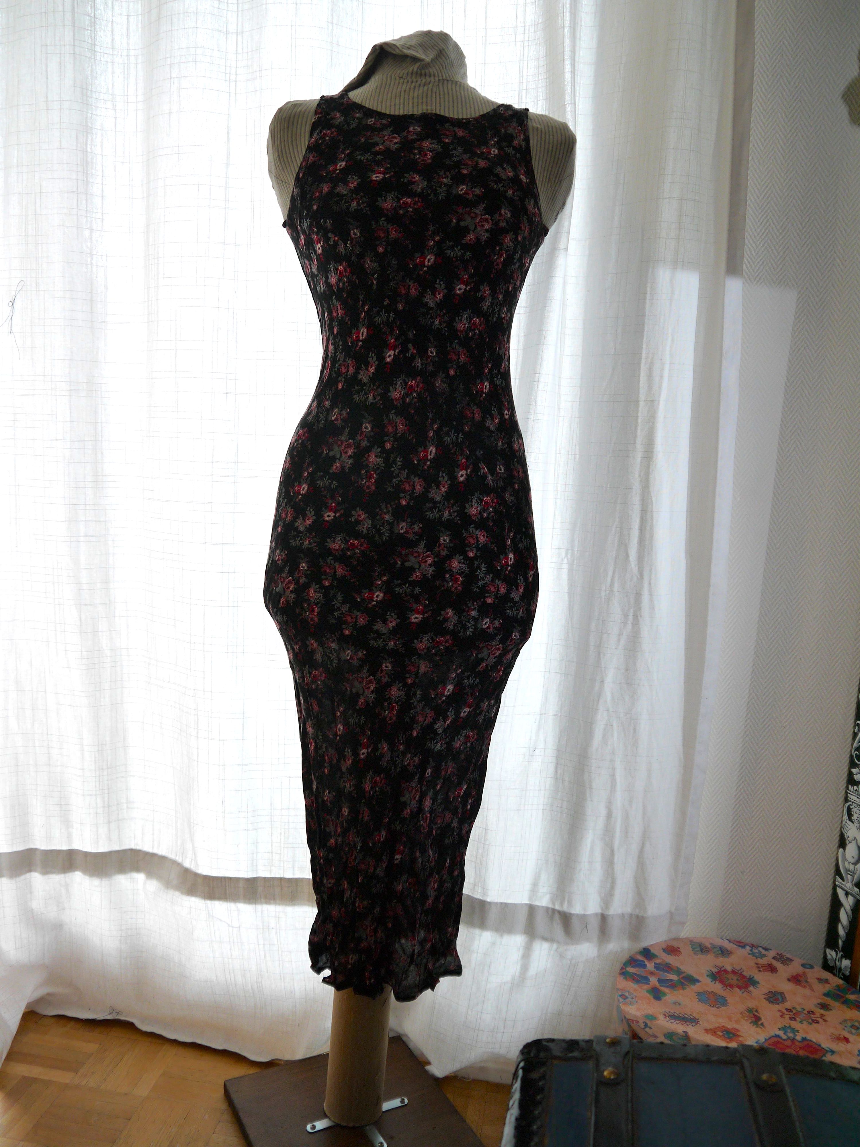 Une robe avec une seule couture (plus les finitions, que j’ai du inventer moi-même – pas beaucoup d’informations de montage sur ce bouquin), faite en spirale, de manière que ça tombe parfaitement sur le corps, suivant ses formes, sans besoin d’aucune pince – voici le miracle du biais!