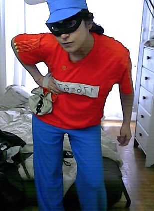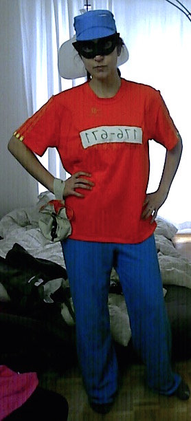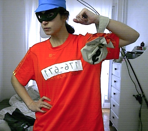 Le chapeau a été fait grâce à ce tutoriel de craftster et le pantalon est un patron de Winter Wear Designs – il s’agit en effet d’un pantalon de pyjama mais qui servait tres bien à ma finalité vu qu’il est facile a faire et bien confortable. Le sac vous le connaissez déjà; le tshirt est un vieux maillot de course de Monsieur que j’ai mis à l’envers et appliqué le numéro de prisonnier.