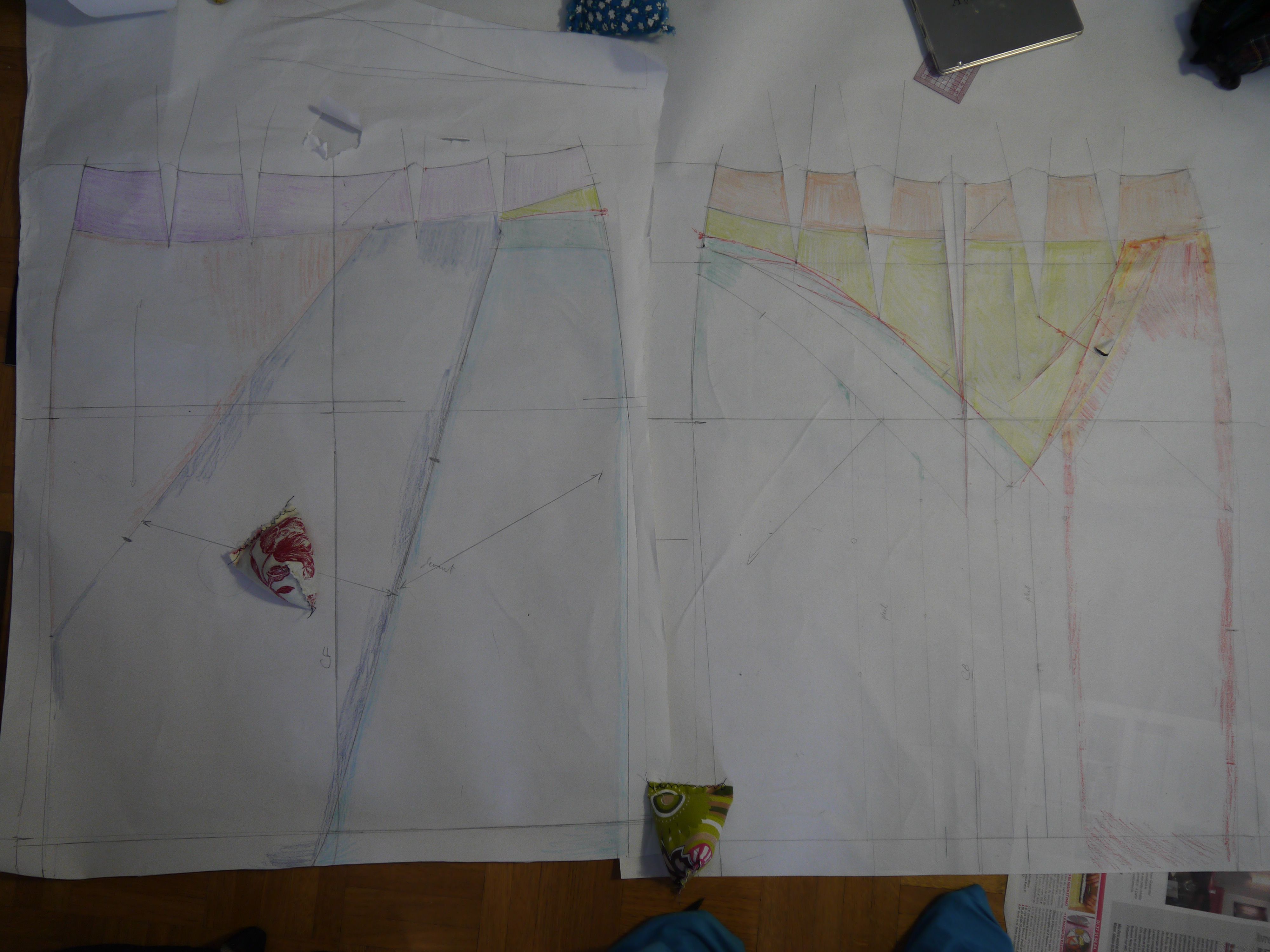 Ainsi, en traçant les lignes de manipulation j’ai fait attention de les faire passer par la pointe des pinces, ce qui me permettra de les fermer avant de dessiner la forme finale de chaque pièce pour avoir une jupe sans pinces. Je publierai des photos du dessin « propre » avant de le découper (vous pouvez voir que j’ai bien fait et refait des lignes pour arriver à un truc satisfaisant).