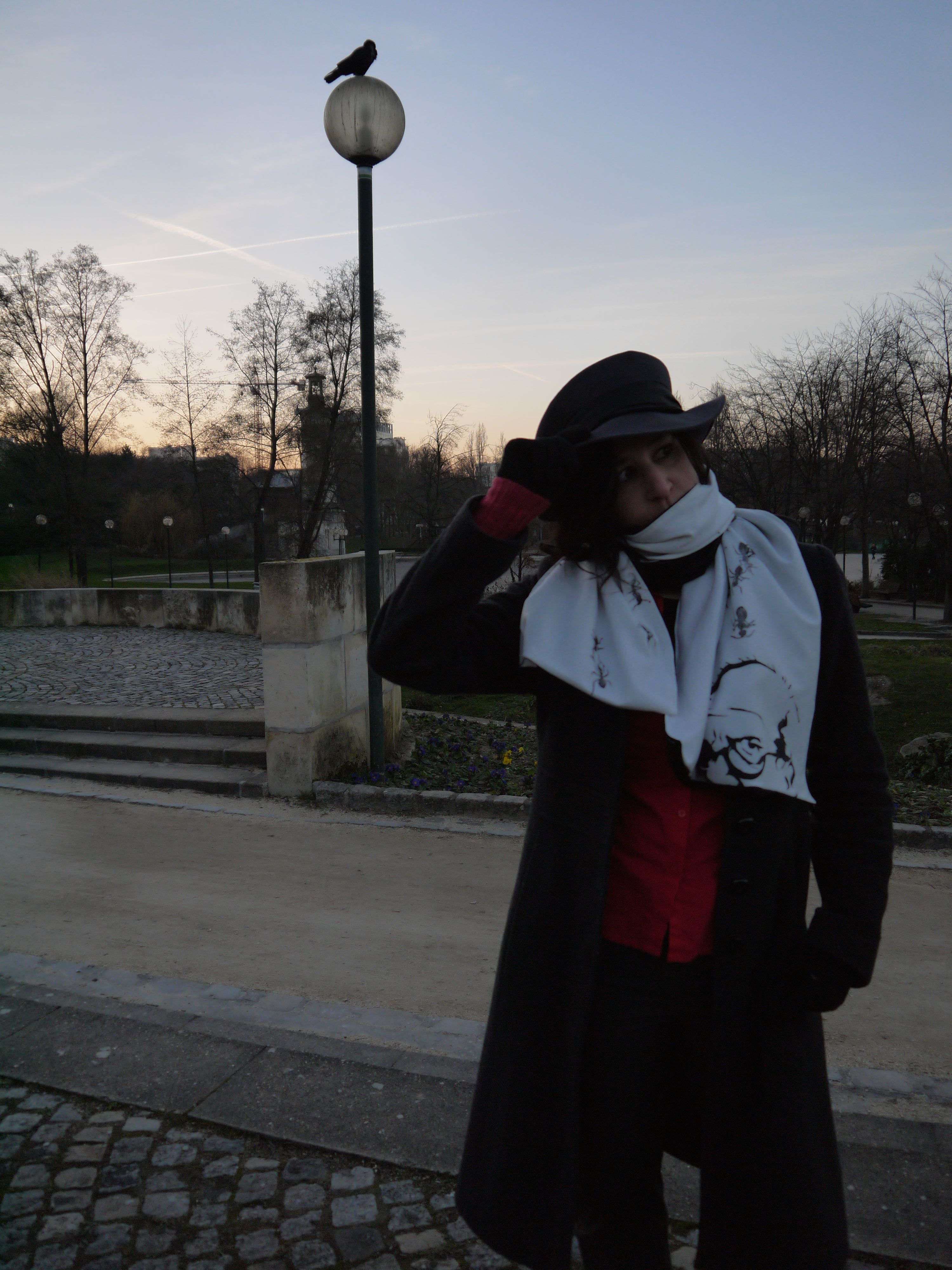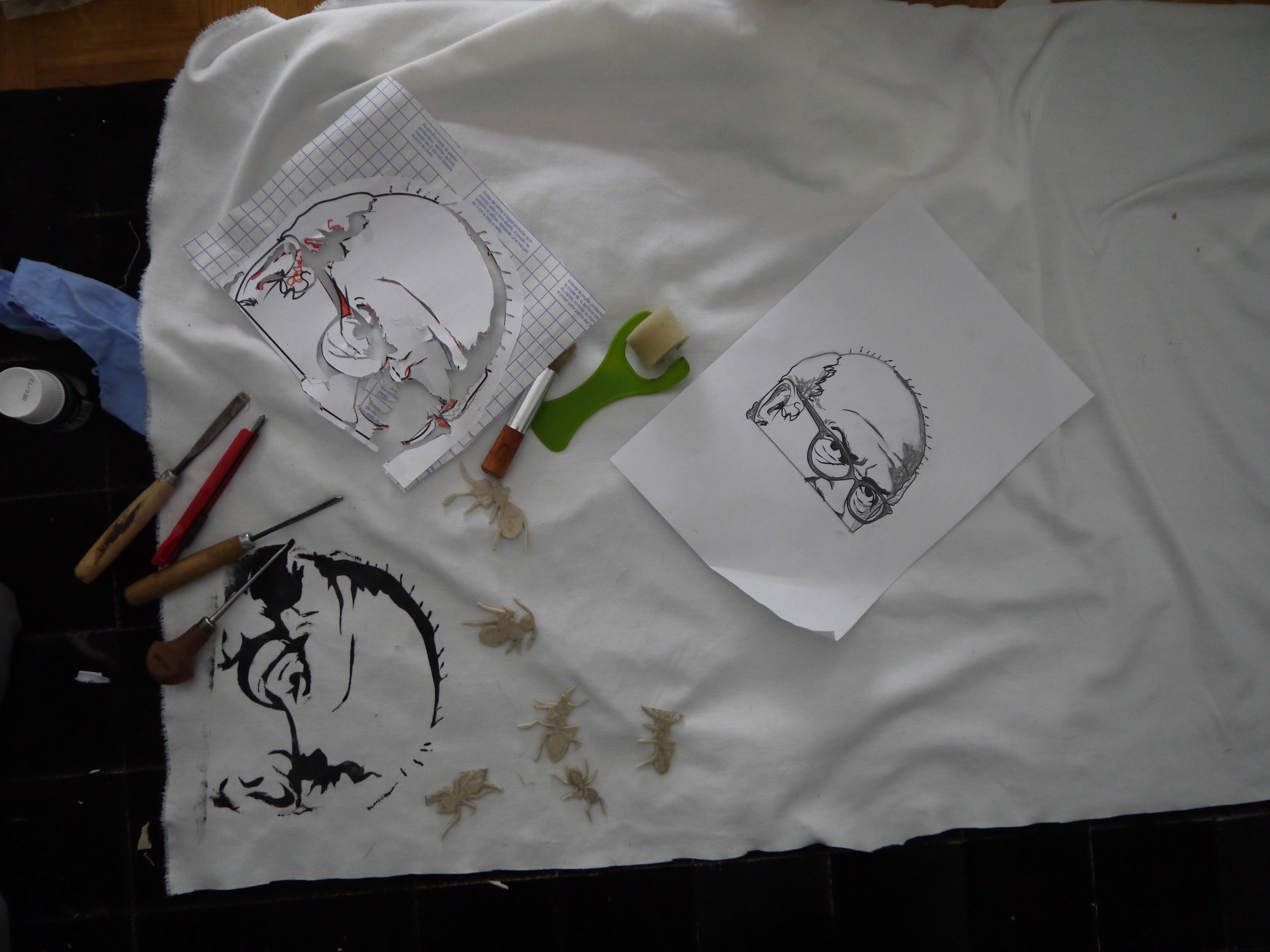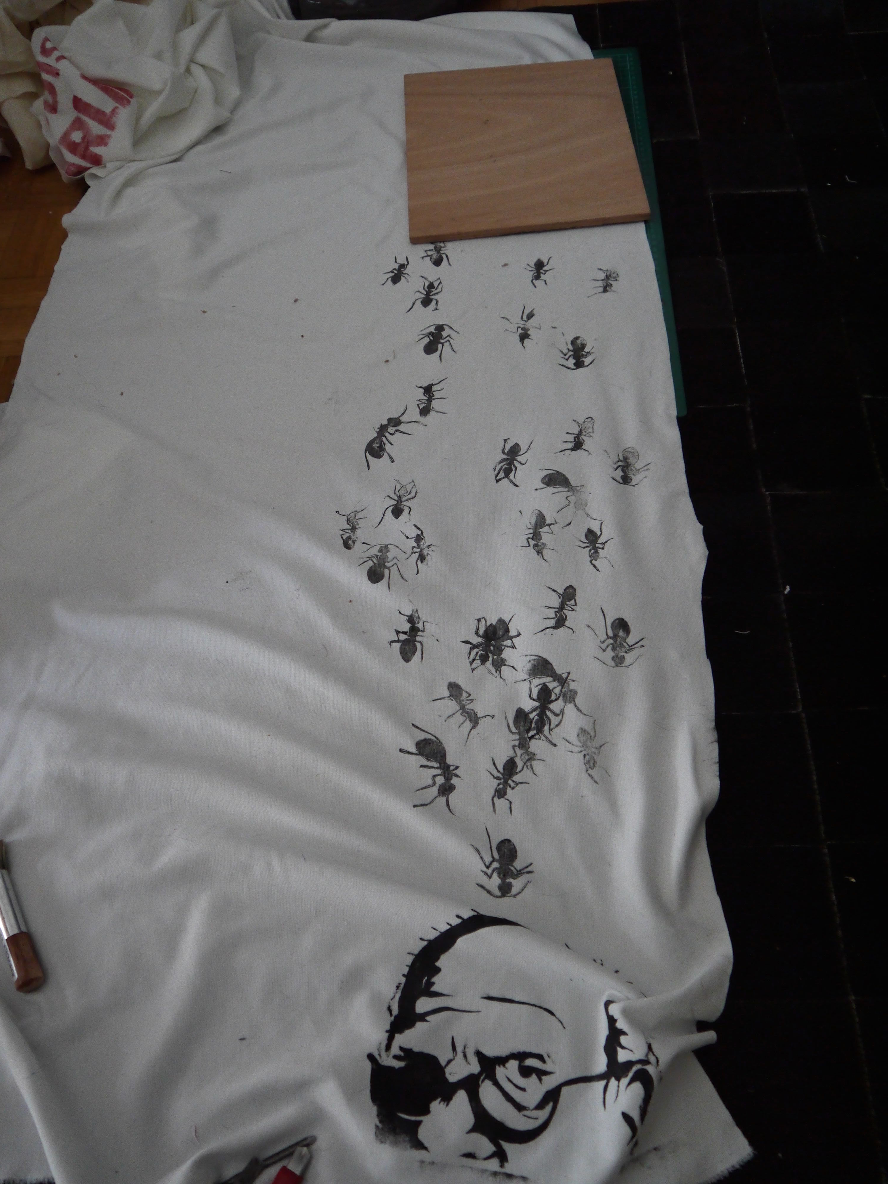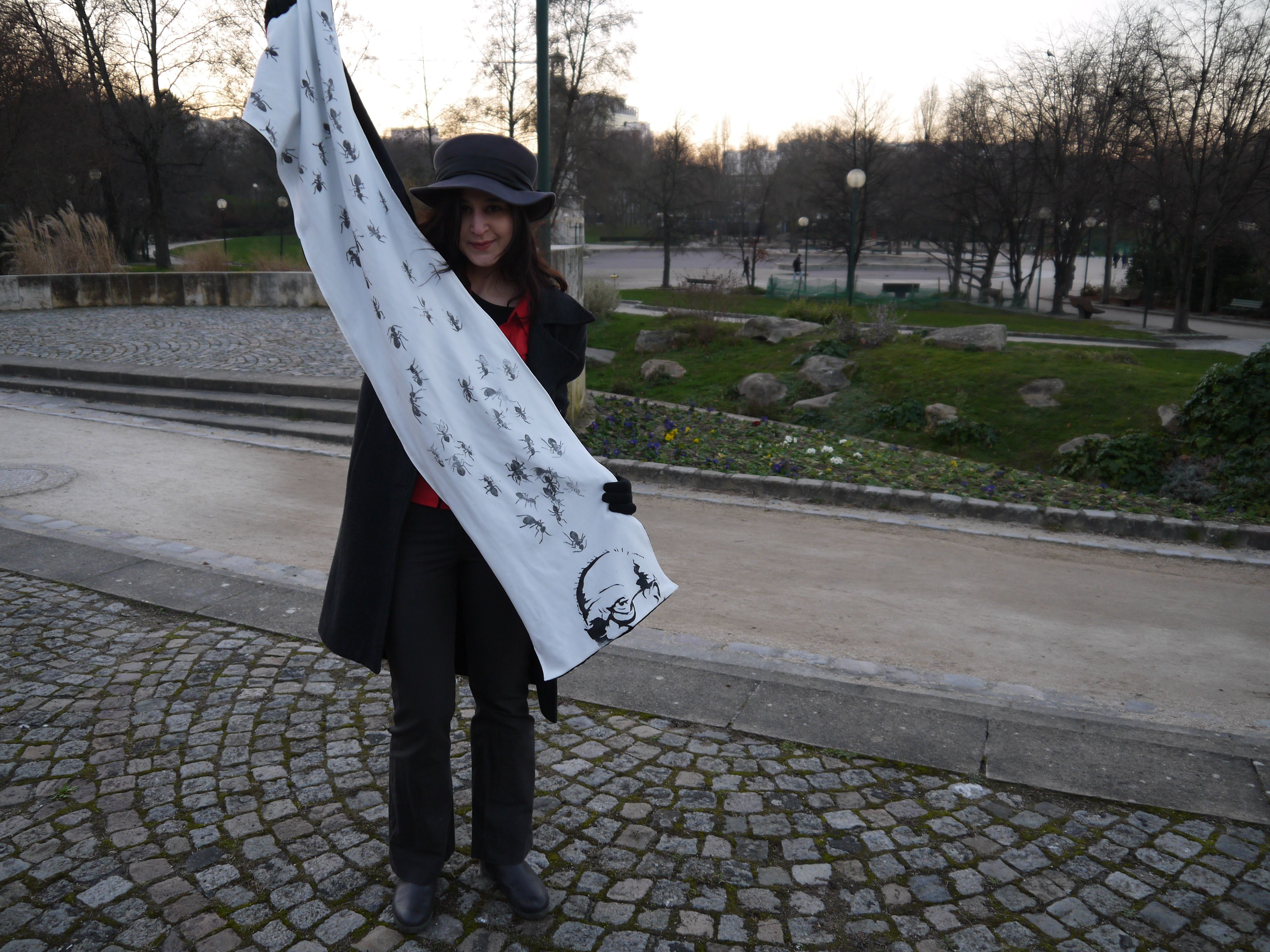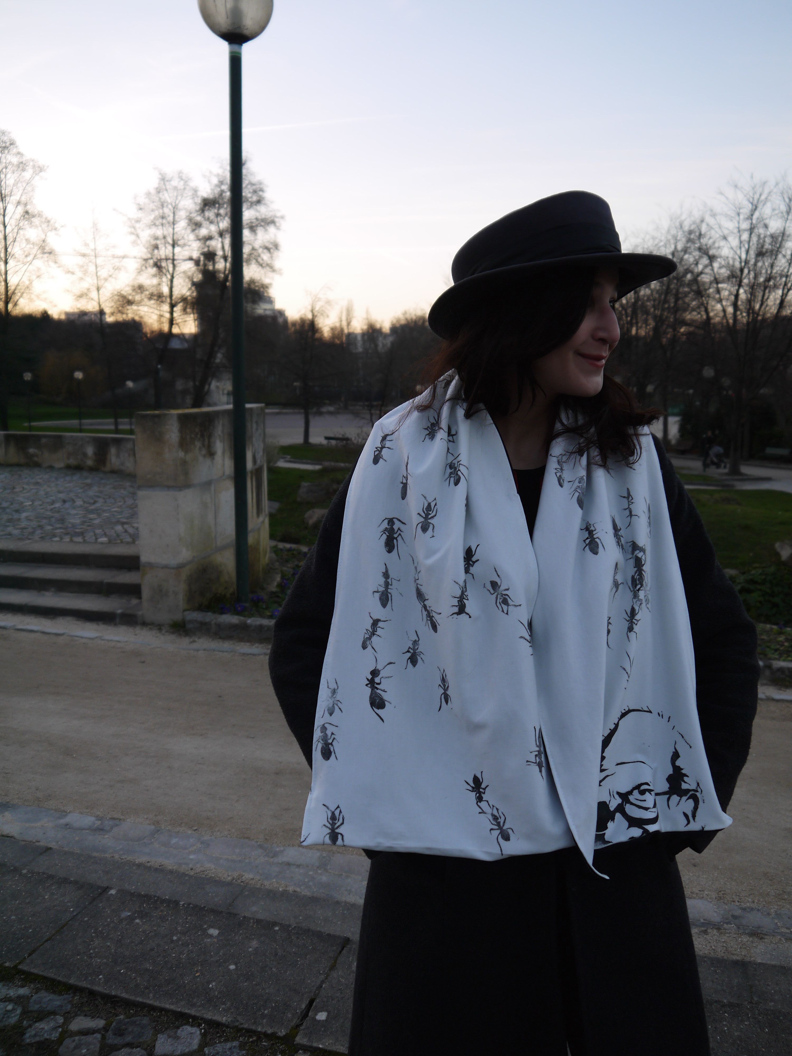 P1050984   Jeudi dernier mon grand-père a été nommé Professeur Émérite de l’Institut de Psychologie de l’Université de São Paulo lors d’une cérémonie solennelle (vidéo en portugais). Ne pouvant pas être présente à cause des restrictions géographiques et économiques, mon hommage lui a été rendu sous forme d’une écharpe personnalisée, inspirée en grande partie de l’article sur May-Britt Moser que j’ai publié il y a presque deux mois. En effet, mon grand-père, Walter Hugo de Andrade Cunha, a été le pionnier de l’Ethologie au Brésil et l’un des fondateurs de l’Institut de Psychologie de l’Université de São Paulo – assez de raisons pour que cet honneur soit plus que mérité. Son principal sujet de recherche ont été les fourmis, notamment celles de l’espèce Paratrechina fulva. Inspirée par tout ça, j’ai mélangé quelques-uns de mes intérêts – à savoir, la gravure, le dessin, la couture et l’impression sur tissu – pour créer cette pièce. P1050952 Les fourmis ont été gravées en taille d’épargne sur des plaques de caoutchouc et découpées pour me laisser la liberté de les positionner à volonté sur le tissu. J’ai ensuite dessiné et coupé un pochoir avec la moitié supérieure de la tête de mon papi (très facilement reconnaissable) pour servir comme « point d’attrait » pour la fourmilière. P1050953   J’ai arrangé les fourmis en différentes positions sur une plaque de bois et les ai imprimées sur le tissu en utilisant le poids de mon corps (plus ou moins comme pour le tshirt « Je Suis Charlie » déjà montré). Pour décider des positions je me suis souvenue de toutes les conversations que j’ai eues (et ai encore souvent) avec mon papi sur le comportement des fourmis et ses propres théories – d’ailleurs révolutionnaires – là-dessus. P1050976 Ensuite j’ai doublé le jersey blanc d’un rectangle de satin noir, surpiquant sur les côtés longs. L’écharpe était prête (et j’en étais fière). P1050986 Elle est élégante, facile à porter et tient bien chaud (pour mon papi qui est si frileux). P1050992 Et surtout, c’est quelque chose de très personnel et unique, pour marquer ce couronnement d’une grande carrière. Est-ce que mes lecteurs sont aussi intéressés par la science que moi? Porteriez-vous une écharpe myrmécophile? (moi oui mais bon, elle était pas à moi celle-là!)
