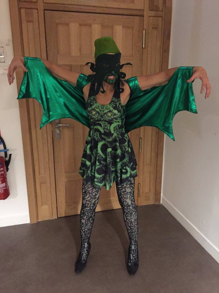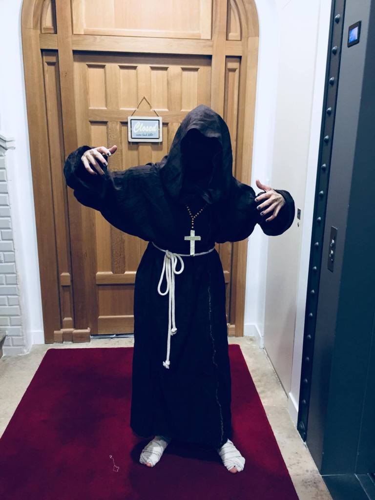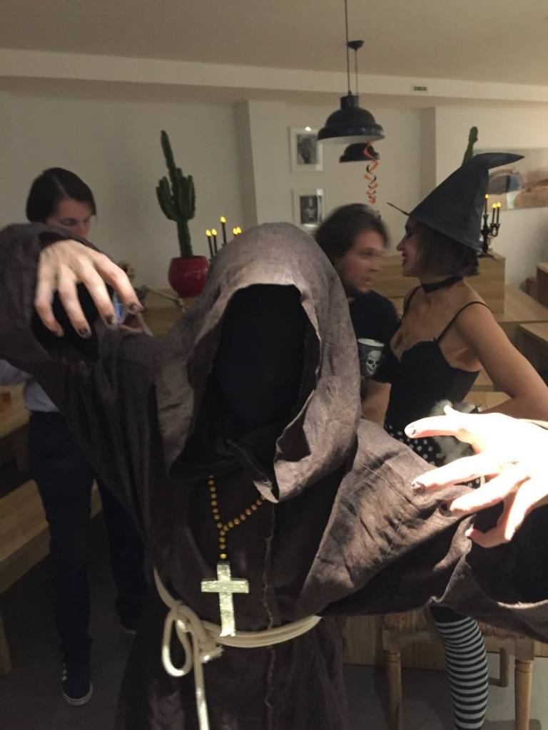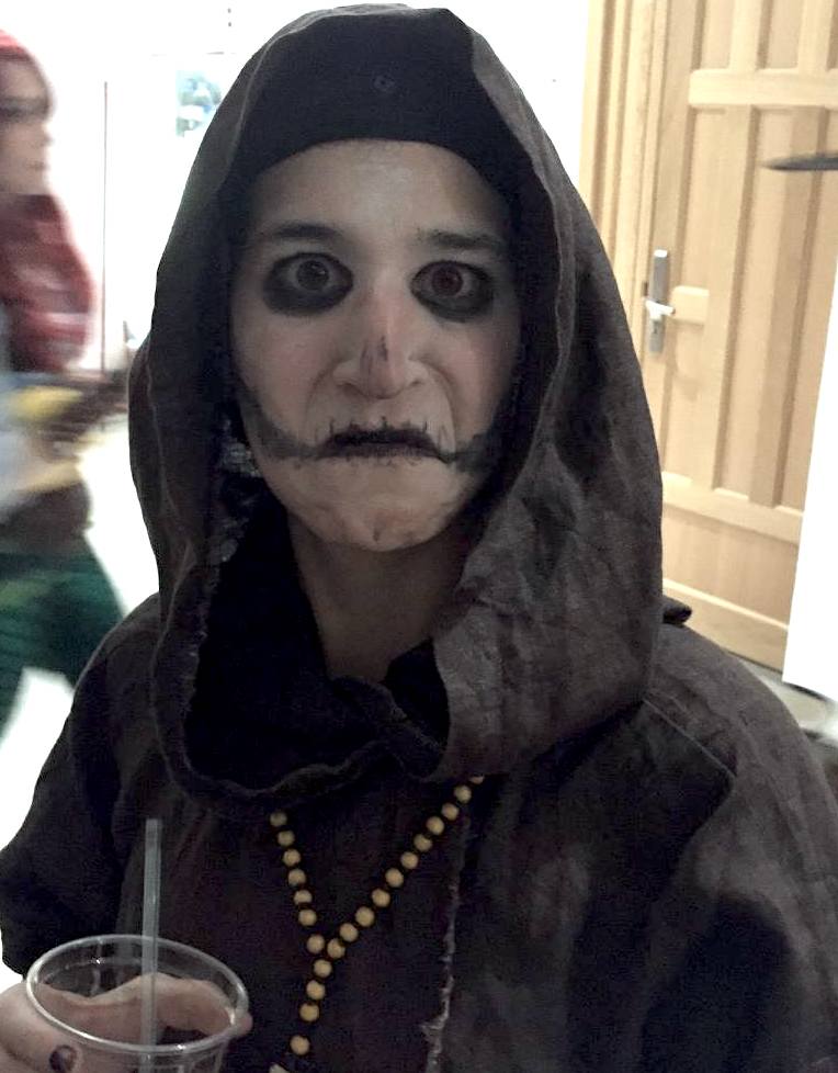 Bien sûr, comme je voulais quand-même profiter de la bouffe et des boissons offertes, je me suis maquillée en dessous – donc c’était un double déguisement moine sans tête/moine cadavre (voir la photo en haut de ce post). J’avais aussi un costume de squelette sous la soutane, mais je n’ai pas trouvé la photo.