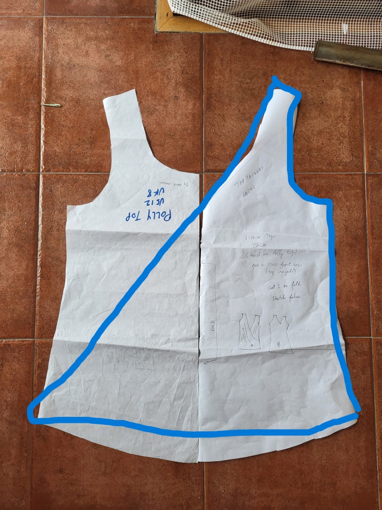 Après avoir imprimé et assemblé ton patron, prends la pièce du devant et trace-la sur un deuxième morceau de papier, en miroir. Tu vas avoir quelque chose de similaire à ça (ignore les encolures différentes) :